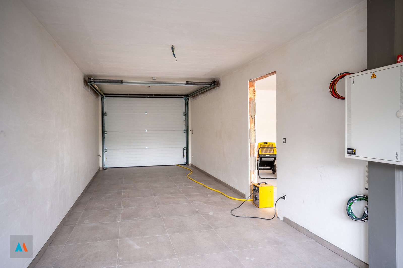 Gelijkvloers: inkomhal, wc, grote open leefruimte met ingerichte keuken en groot schuifraam naar terras en tuin, bureau/speelkamer, inpandige garage;